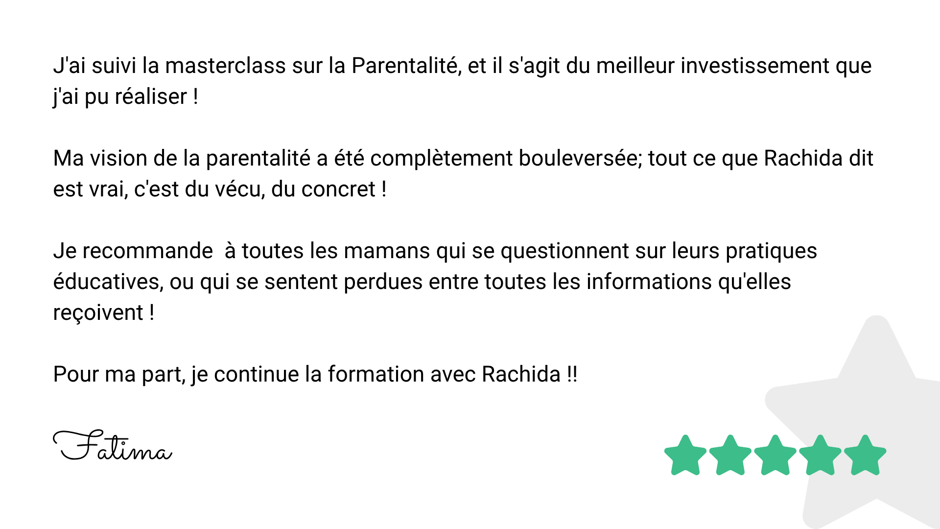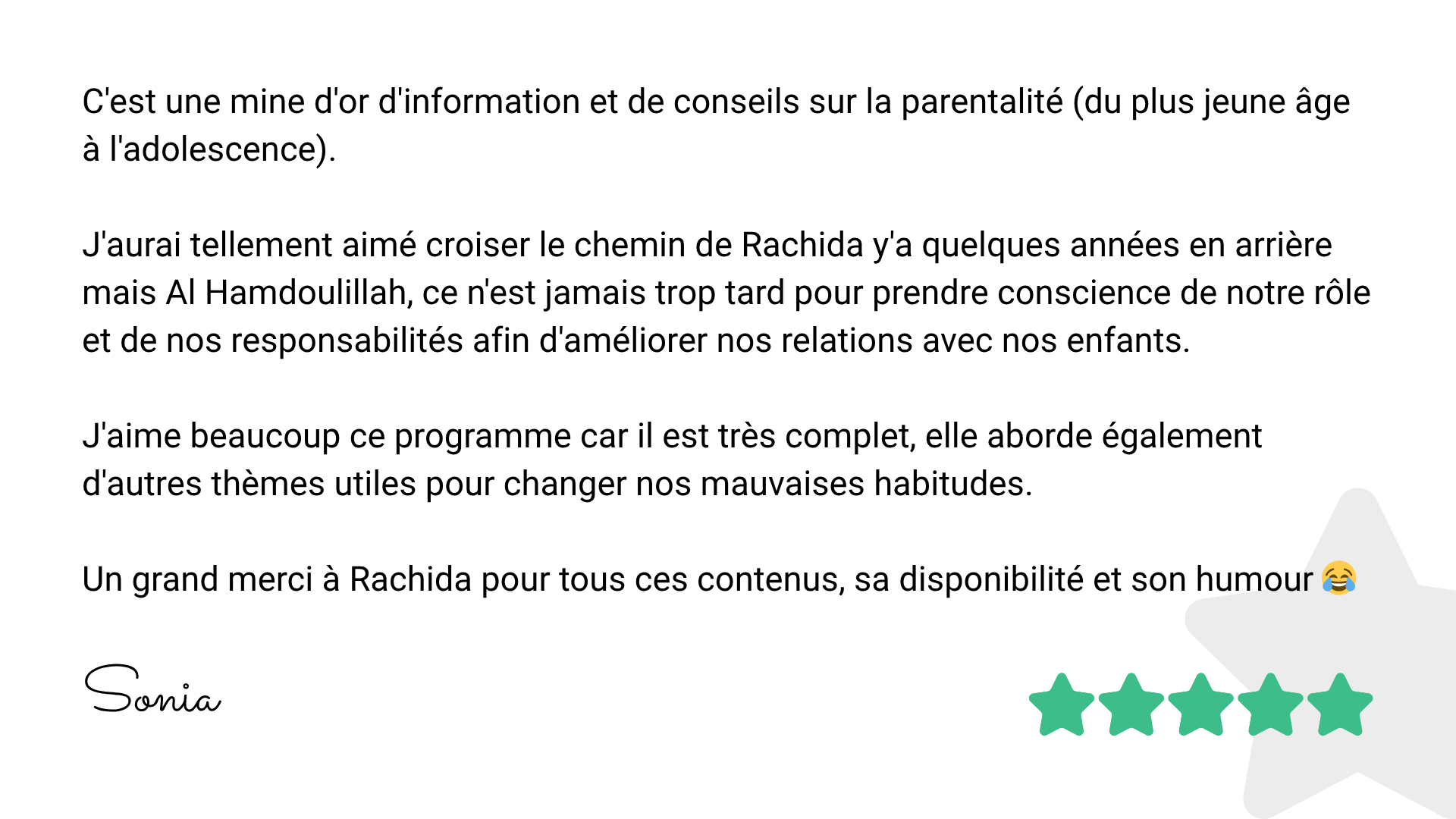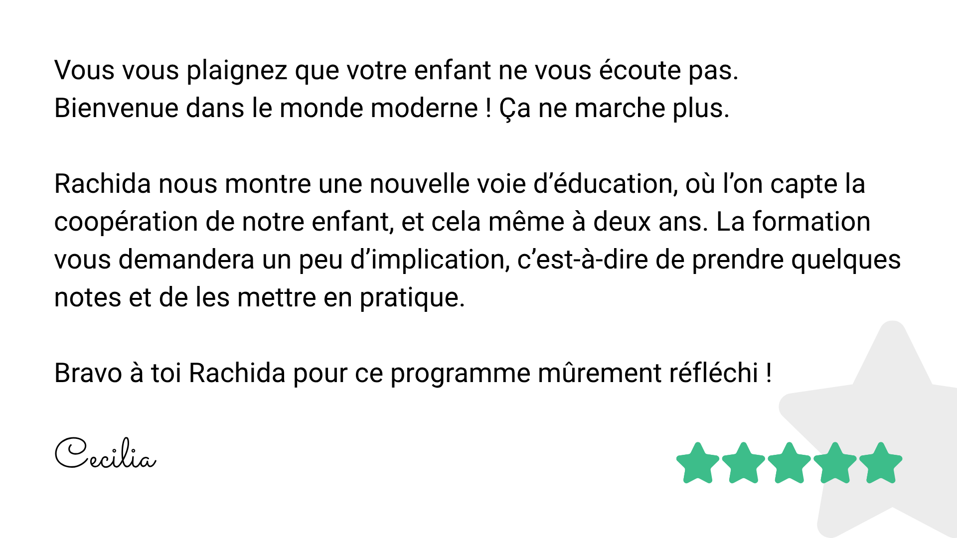 C’est un moyen de démolir les idées fausses dû à ta propre éducation, nous reconstruirons ensemble des fondations solides pour te positionner en maman FERME et BIENVEILLANTE, et enfin tu bâtiras une relation saine avec ton enfant, une relation consolidée par l'amour, le dialogue, le respect et la confiance mutuelle.