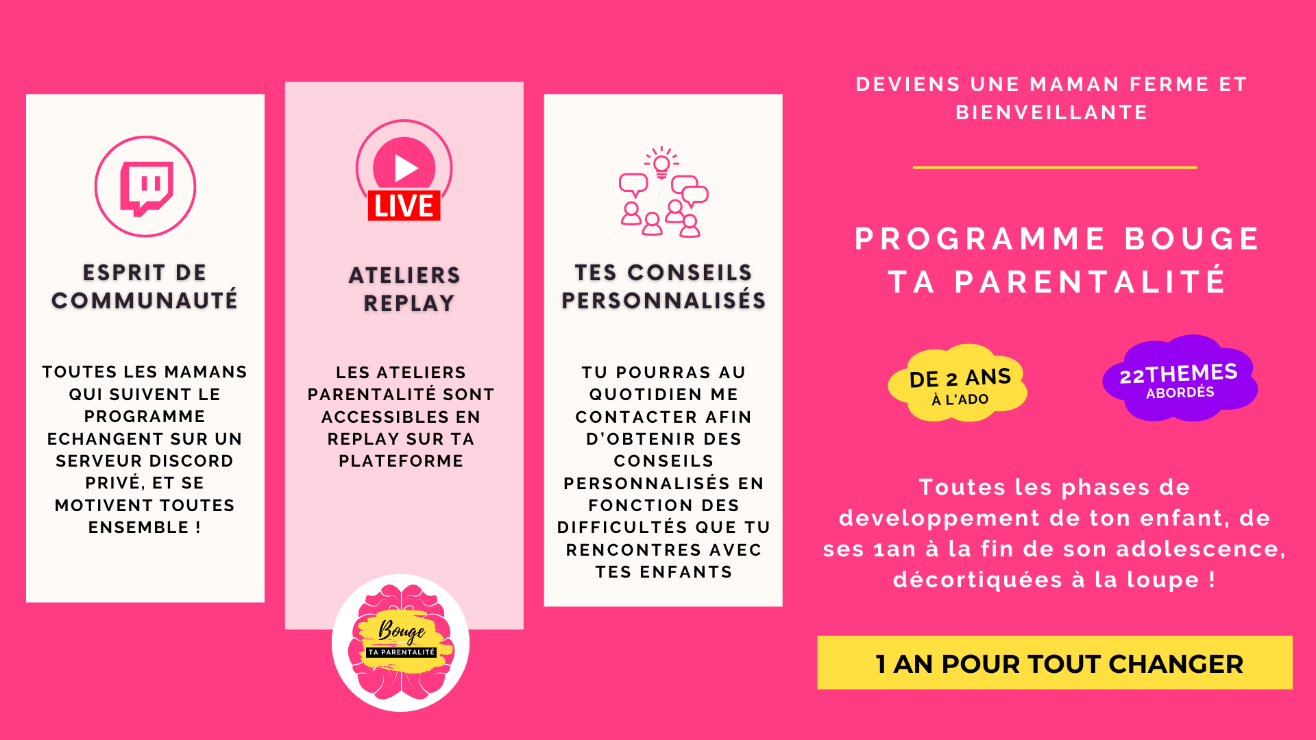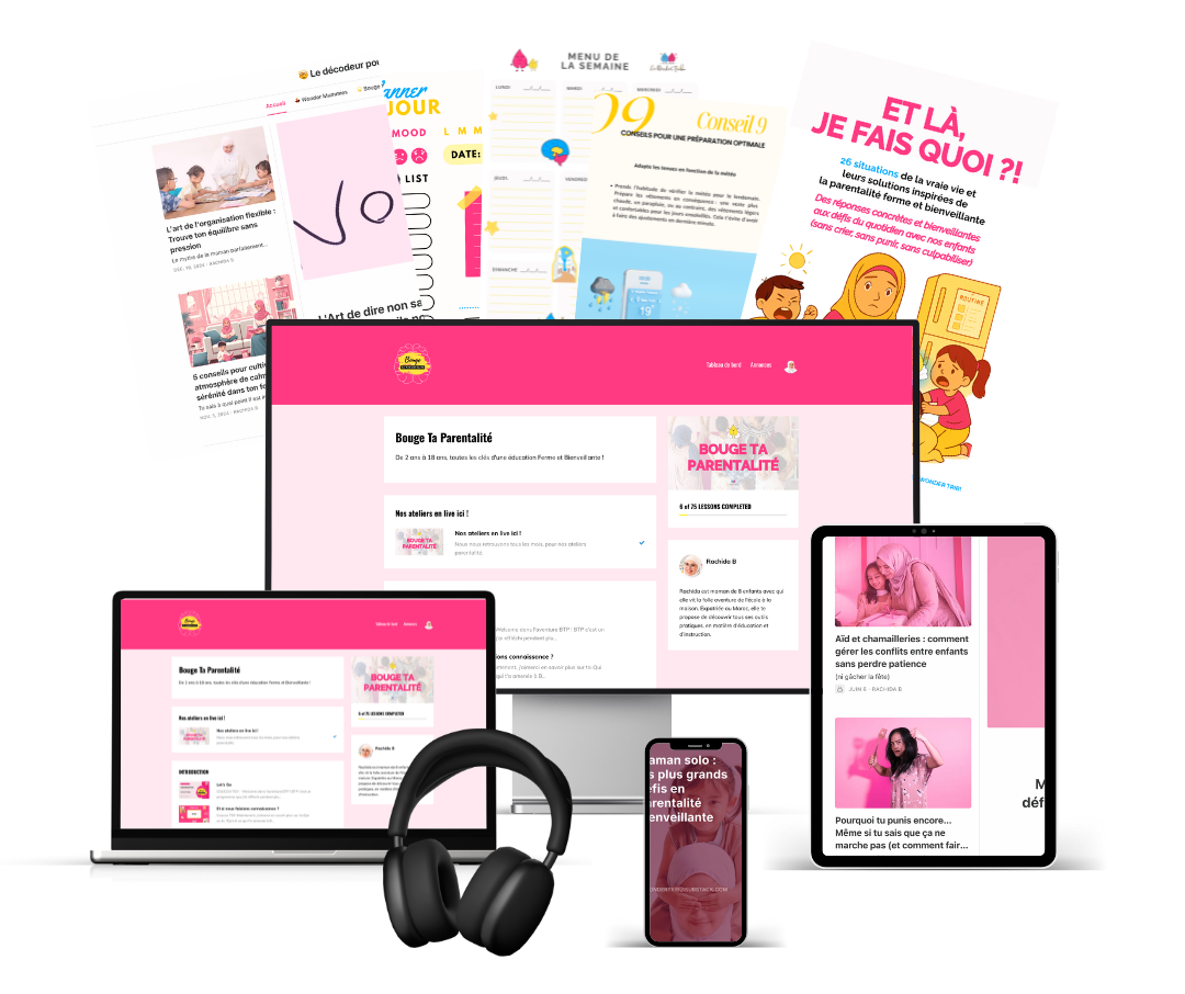 En adhérent au MEMBERSHIP des WONDER MUMMIES, tu auras accès aux vidéos du programme BTP, animé par Rachida, qui te permettront de comprendre les besoins de ton enfant, en fonction de son stade de développer, et de savoir comment adopter une posture parentale ferme et bienveillante.